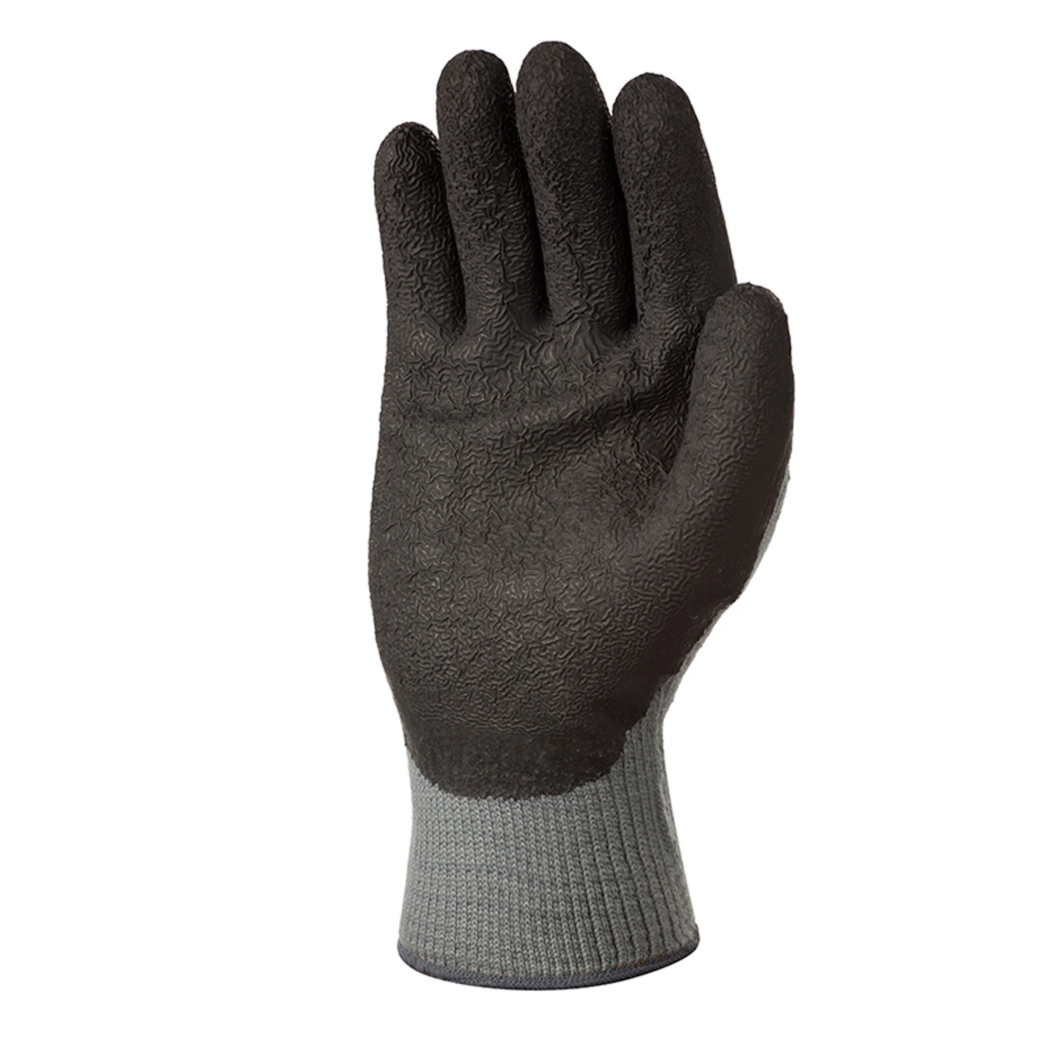 Reinforced grip glove. Double latex coating in the area of the glove subject to most stress; between thumb and index finger.